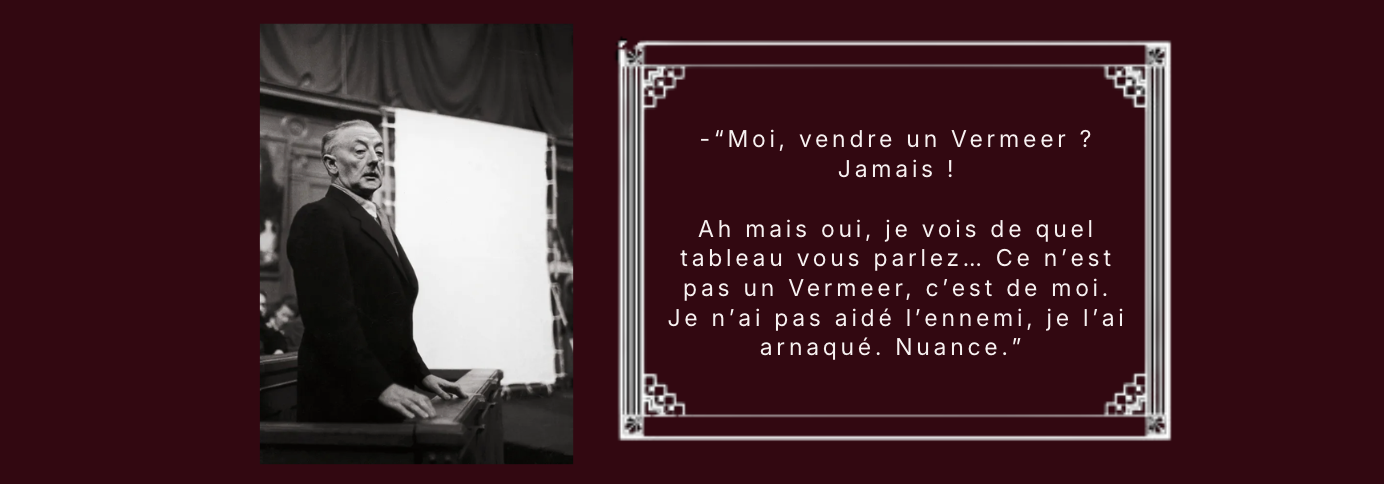 Le contexte : Pays-Bas, après-guerre. L’homme est arrêté : on l’accuse d’avoir vendu un Vermeer aux nazis. En clair, il est accusé de collaboration. A priori, ça sent très mauvais pour lui…